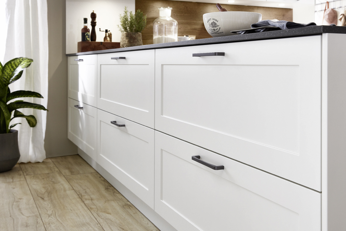 Inklusive Einbaubackofen schwarz Junker JF1300061 Energieeffizienzklasse A, Glaskeramik Kochfeld Junker JR36DT54, Landhauskamin mit Lüfterbaustein Airforce F96-90 Energieeffizienzklasse C, Kühlschrank Laurus LKG88E Energieeffizienzklasse E, Einbau-Designspüle Schock Grando M-100, Unterschrank mit Großraumauszügen, Wandschränken mit Glasrahmentür, Wandschrankregal.