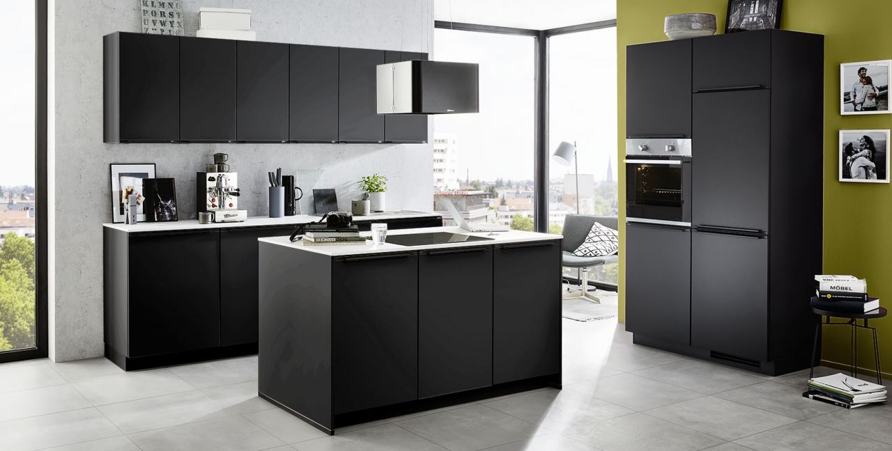 Küche mit freistehender Kochinsel Nobilia Laser / Touch ca. 240 / 120 / 153 cm, Front: Alpinweiß / Lacklaminat, Schwarz supermatt, Arbeitsplatte: Alpinweiß